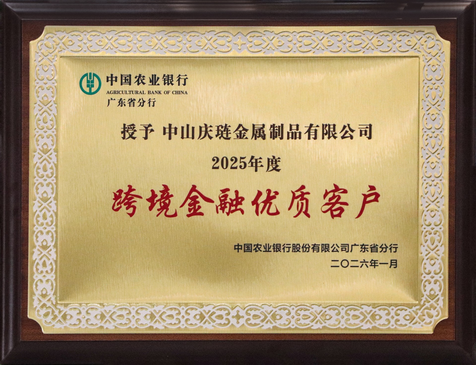 3月26日,凭借在跨境金融领域的卓越表现与良好的企业信誉,中山庆琏被中国农业银行股份有限公司广东省分行授予 “2025年度跨境金融优质客户” 荣誉称号。
