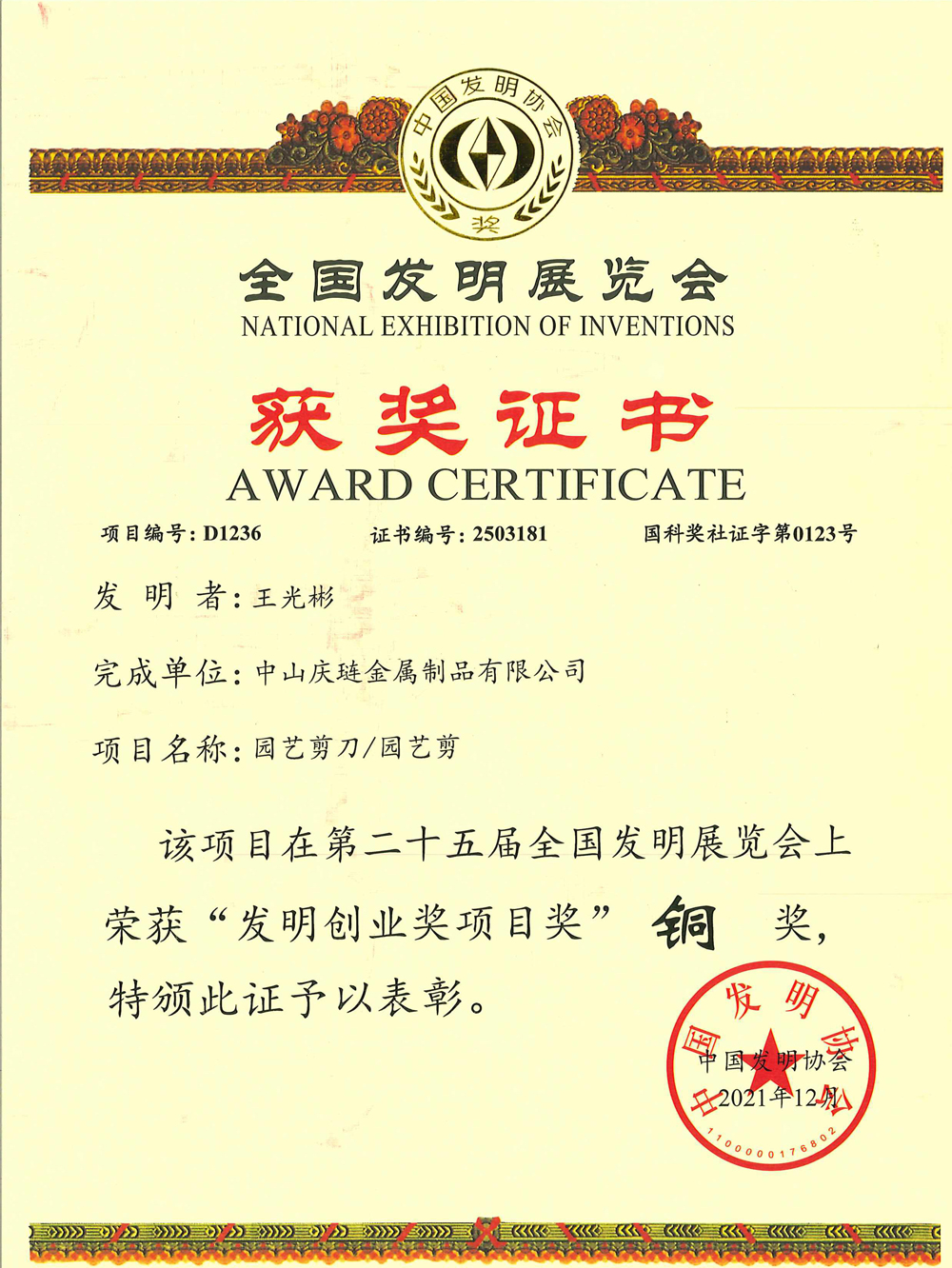 中山庆琏派出的参展团队携带精心准备的四个研发项目参加了本次展览会,其中的“园艺剪刀”项目荣获本次展会的“发明创业奖”铜奖!