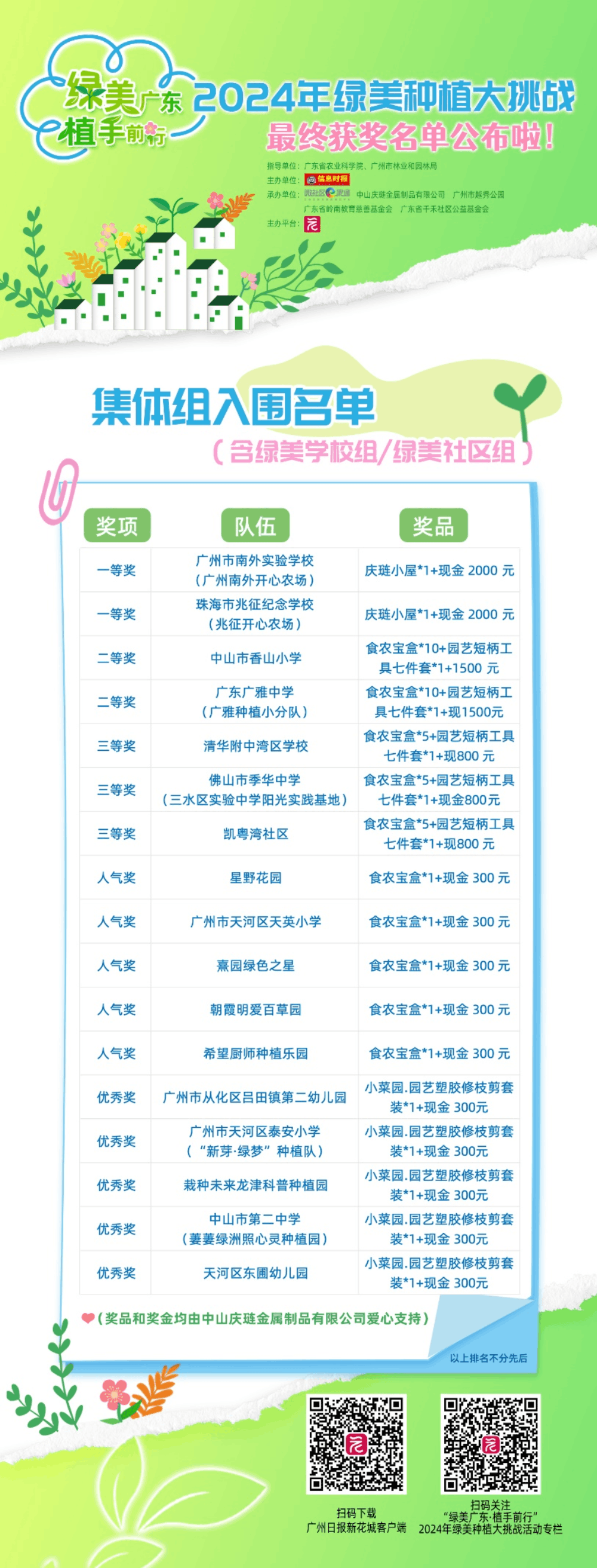 本次“2024 绿美种植大挑战”奖项涵盖了个人组、集体组等多个类别。活动邀请了广东省农业科学院蔬菜研究所主任张白鸽、省农业技术推广中心高级农艺师李强、华南农业大学林学与风景园林学院原教授孙光闻、园艺工具大咖梁卫明等担任评委,通过“全网点赞+评委打分”的形式,对“种植秀”短视频的种植创意、种植成效以及视频质量进行综合考察评选,决出了相关奖项。