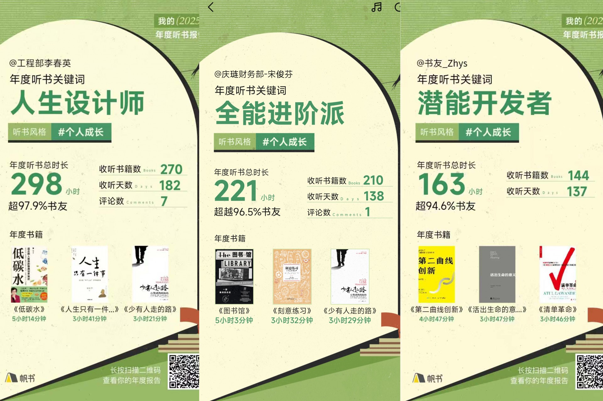 数据生动地记录了这份成长:年度最高听书总时长共298小时、最高收听书籍达270本、最长连续收听182天。根据阅读行为与内容偏好,书友们也被赋予了个性化的年度标签:“潜能开发者” “破圈行动派” “终身成长派”“全能进阶派”……这些关键词勾勒出阅读如何以不同姿态,陪伴每位书友走向更丰富的自我。