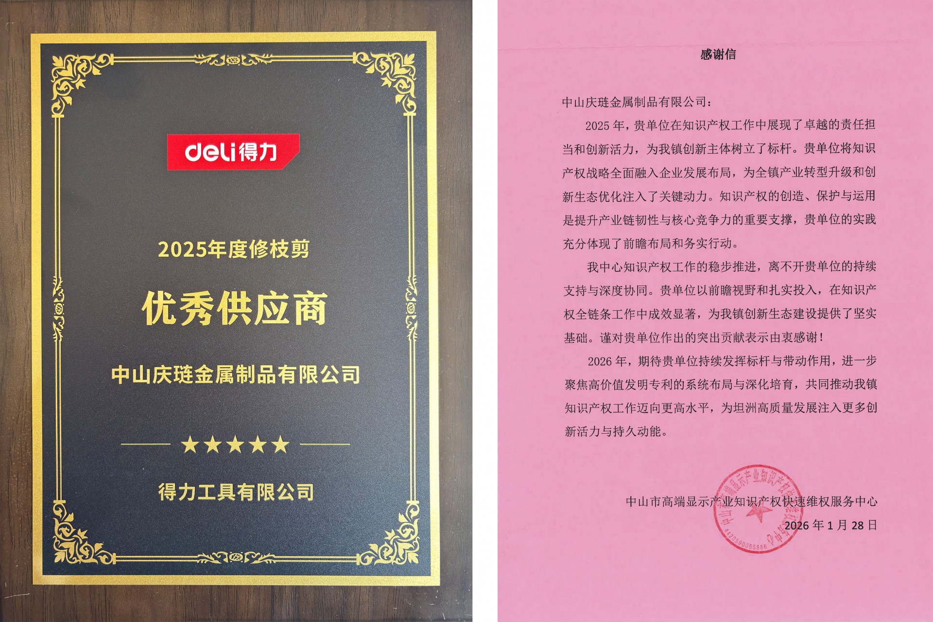 在2026年的开篇之际,中山庆琏接连收到来自市场与政府的肯定。公司凭借卓越的产品品质与稳定的供应链服务,荣获得力工具有限公司授予的“2025年度修枝剪优秀供应商”称号;同时,公司在2025年知识产权工作中的卓越贡献与标杆引领,也获得了中山市高端显示产业知识产权快速维权服务中心的专函感谢。