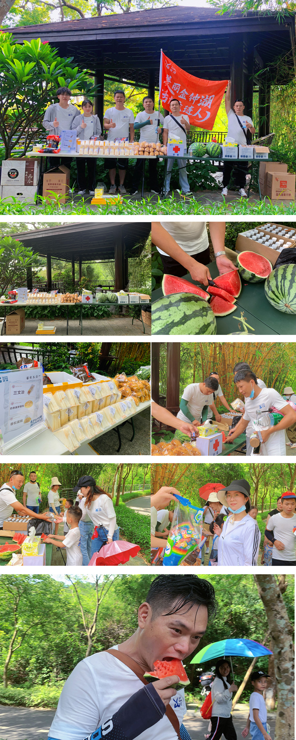 辛勤的活动筹备人员在清晨6点钟多就预先将大批的物资运入园内,设立中途补给点,为大家提供西瓜、矿泉水、面包、士力架等物资,为大家冲刺终点、挑战自我补充能量。这群默默奉献的庆琏人,犹如道路中的一块块铺路石,支撑着大家前进的步伐。