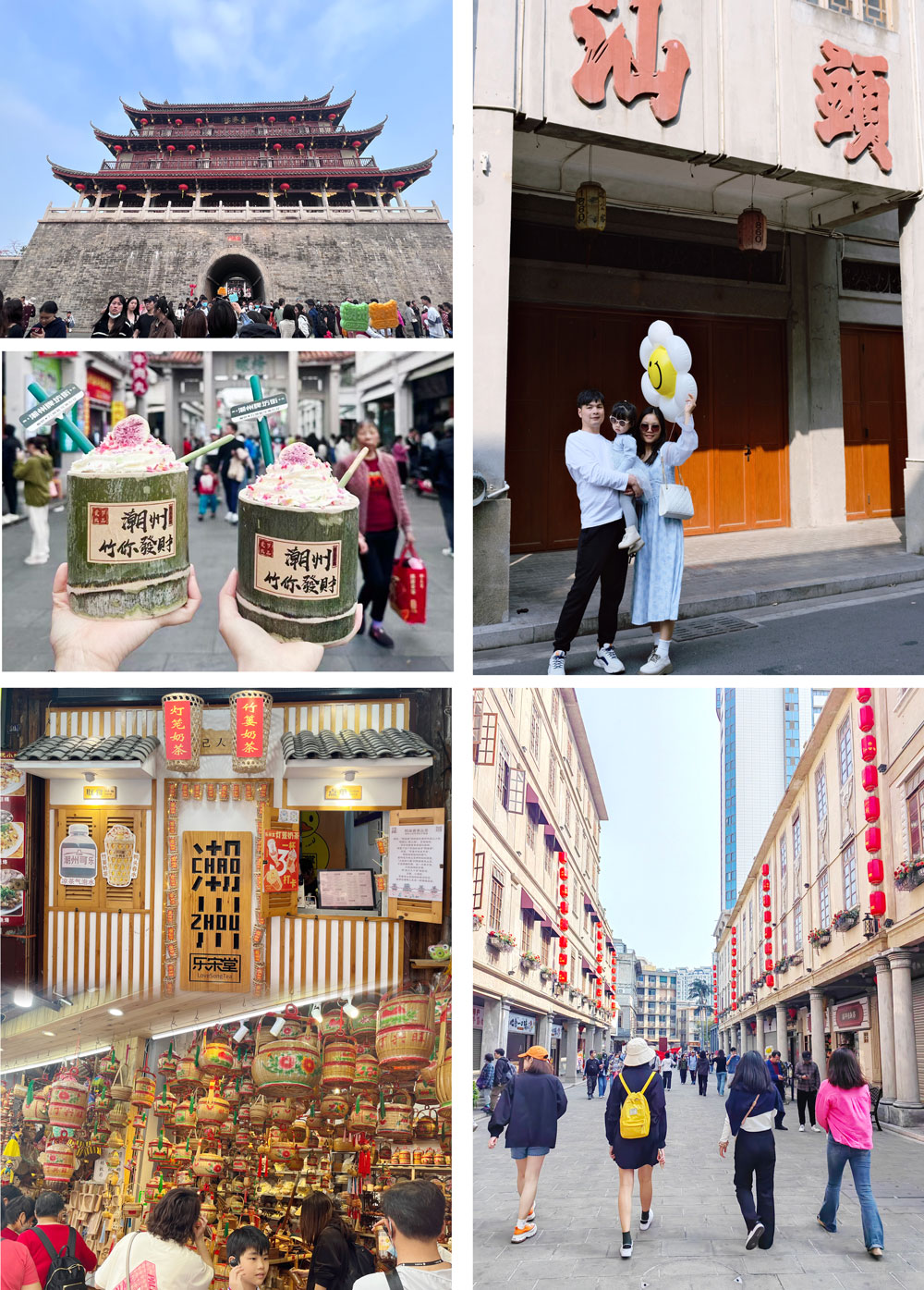 第二天,小伙伴们来到了有着小紫京城之称的潮州古城。热闹的太平路牌坊古街,是潮州市的文化地标之一,23座古牌坊连接起51条古街巷。这里也被誉为“中国美食孤岛”。牛肉丸、蚝烙、杏仁茶、卤水、砂锅粥在这条古街上琳琅满目。老街的建筑兼容并蓄,中西结合,独具特色,见证着汕头经济开放和文化交融的辉煌,值得我们去细细欣赏,聆听她诉说过去。