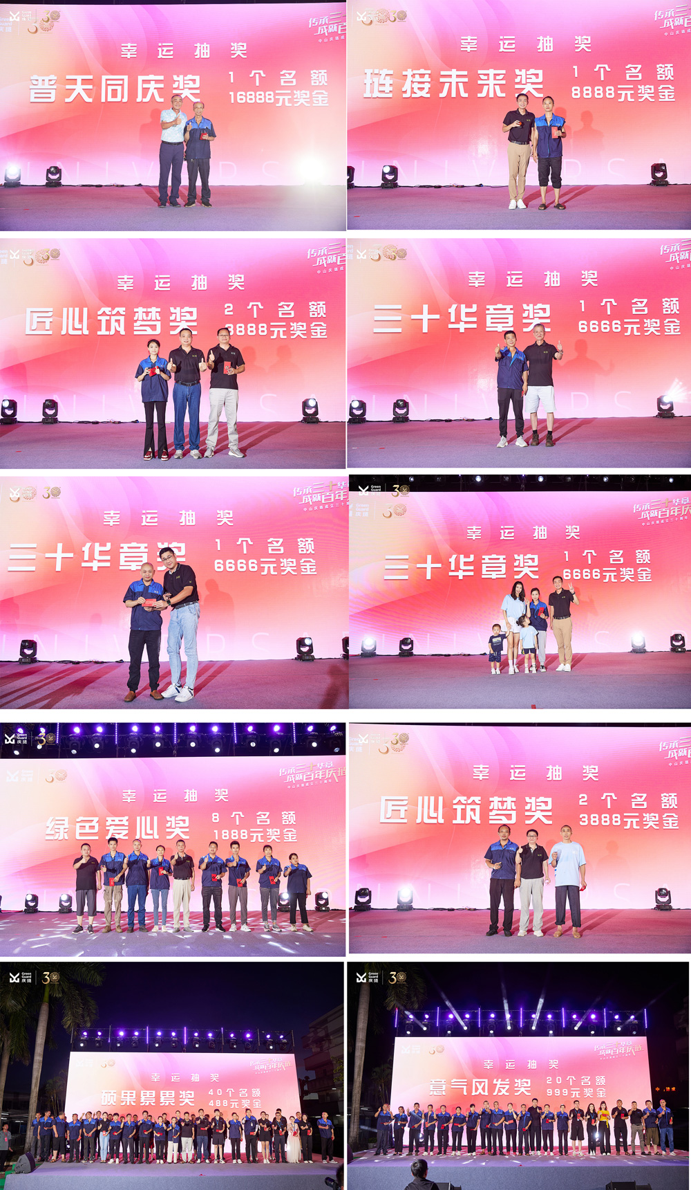 本次晚会最让人期待的抽奖环节更是将现场气氛不断推至高潮。掌声雷动、尖叫阵阵,随着董事长、董事长夫人、执董、常董和总经理的不断加码,抽奖总金额接近60万元,中奖率高达90%!人均奖金也超过了800元,从最高奖项的16888元到保底的368元,每个人都收获满满。