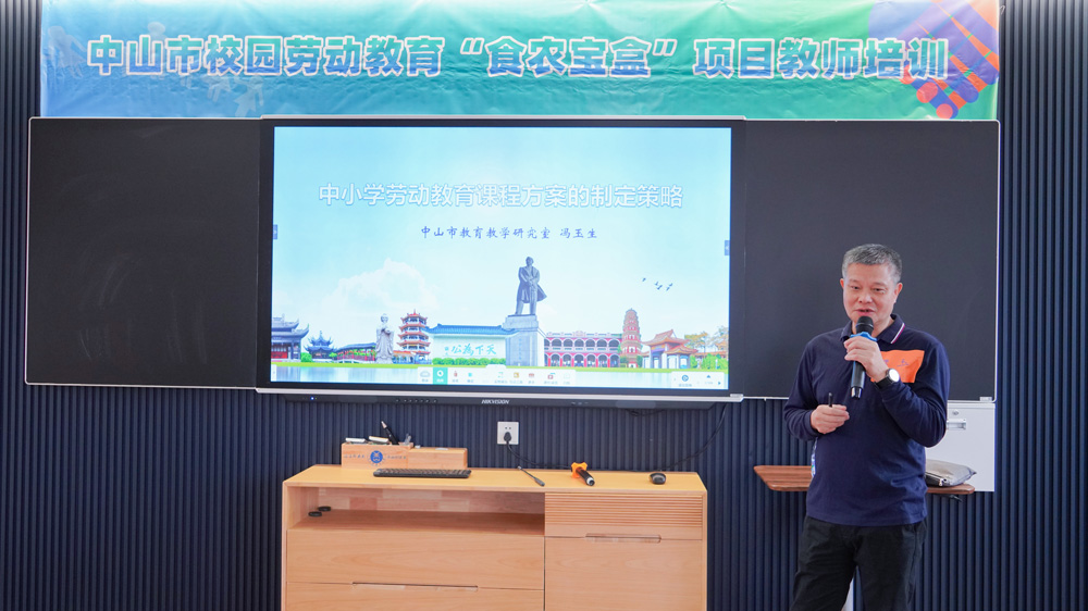 课程正式开始前,11所项目学校的老师们围在一起,通过分享“让自己感到最幸福的名字”、“一个词概括对幸福生活的向往”,在欢乐的氛围中进一步加深对彼此的了解。接着,中山市教育教学研究室冯玉生部长为大家带来《中小学劳动课程方案规划与制定》课程。