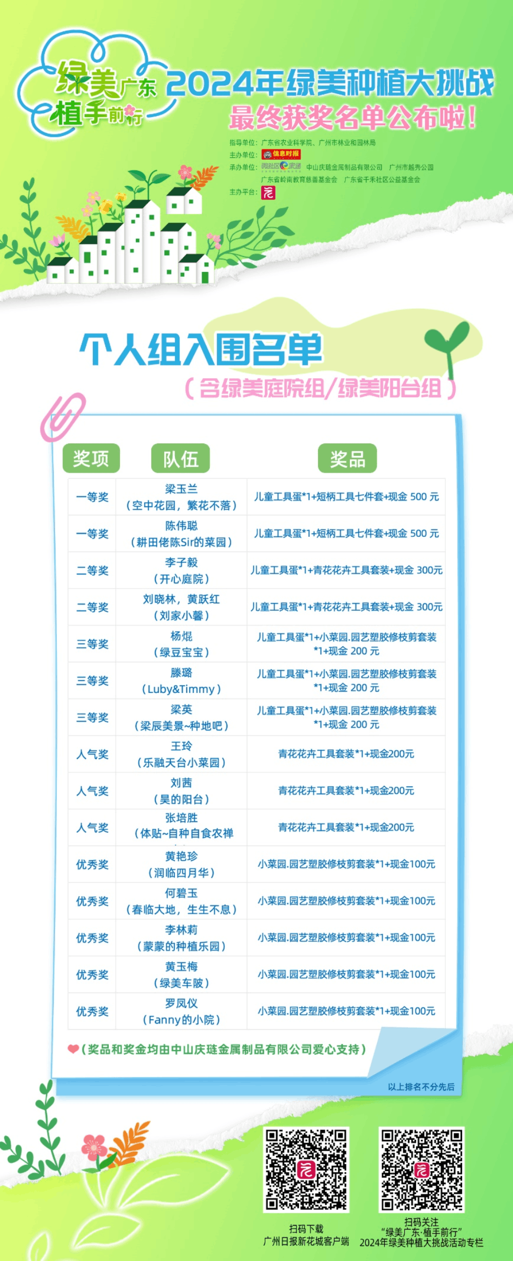 本次“2024 绿美种植大挑战”奖项涵盖了个人组、集体组等多个类别。活动邀请了广东省农业科学院蔬菜研究所主任张白鸽、省农业技术推广中心高级农艺师李强、华南农业大学林学与风景园林学院原教授孙光闻、园艺工具大咖梁卫明等担任评委,通过“全网点赞+评委打分”的形式,对“种植秀”短视频的种植创意、种植成效以及视频质量进行综合考察评选,决出了相关奖项。