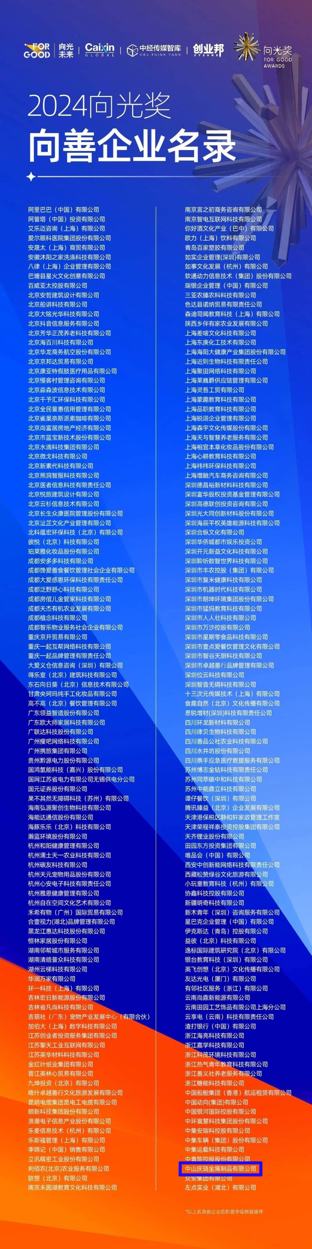 向阳而生,积善前行。经过数周的背景及舆情调查,2024向光奖丨向善企业名录正式发布!中山庆琏金属制品有限公司在内的208家企业成功入选。