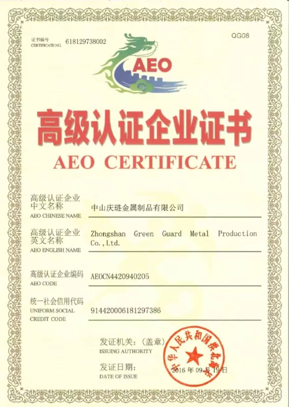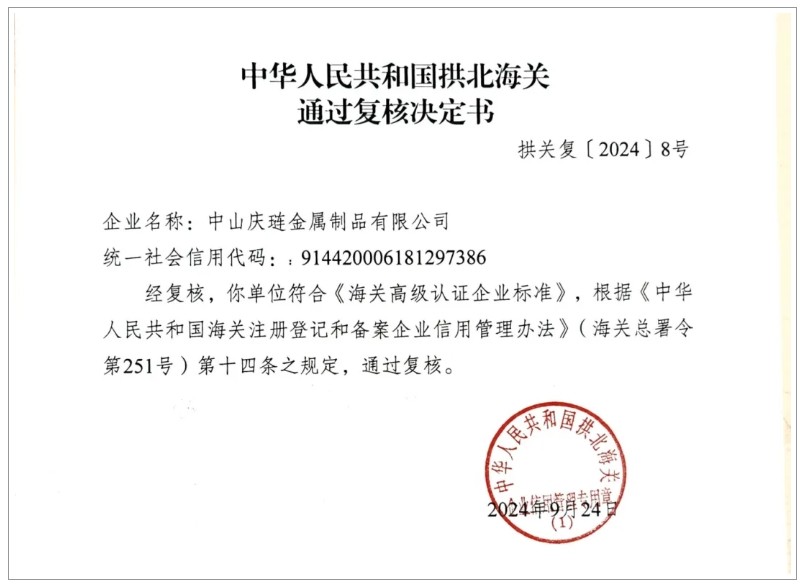 9月24日,我公司接拱北海关通知,经审核,中山庆琏符合《海关高级认证企业标准》,顺利通过复核。这标志着中山庆琏在执行AEO所要求的内部控制、财务状况、守法规范、贸易安全四大标准的合规管理水平和安全运营能力再次得到海关的权威认可。