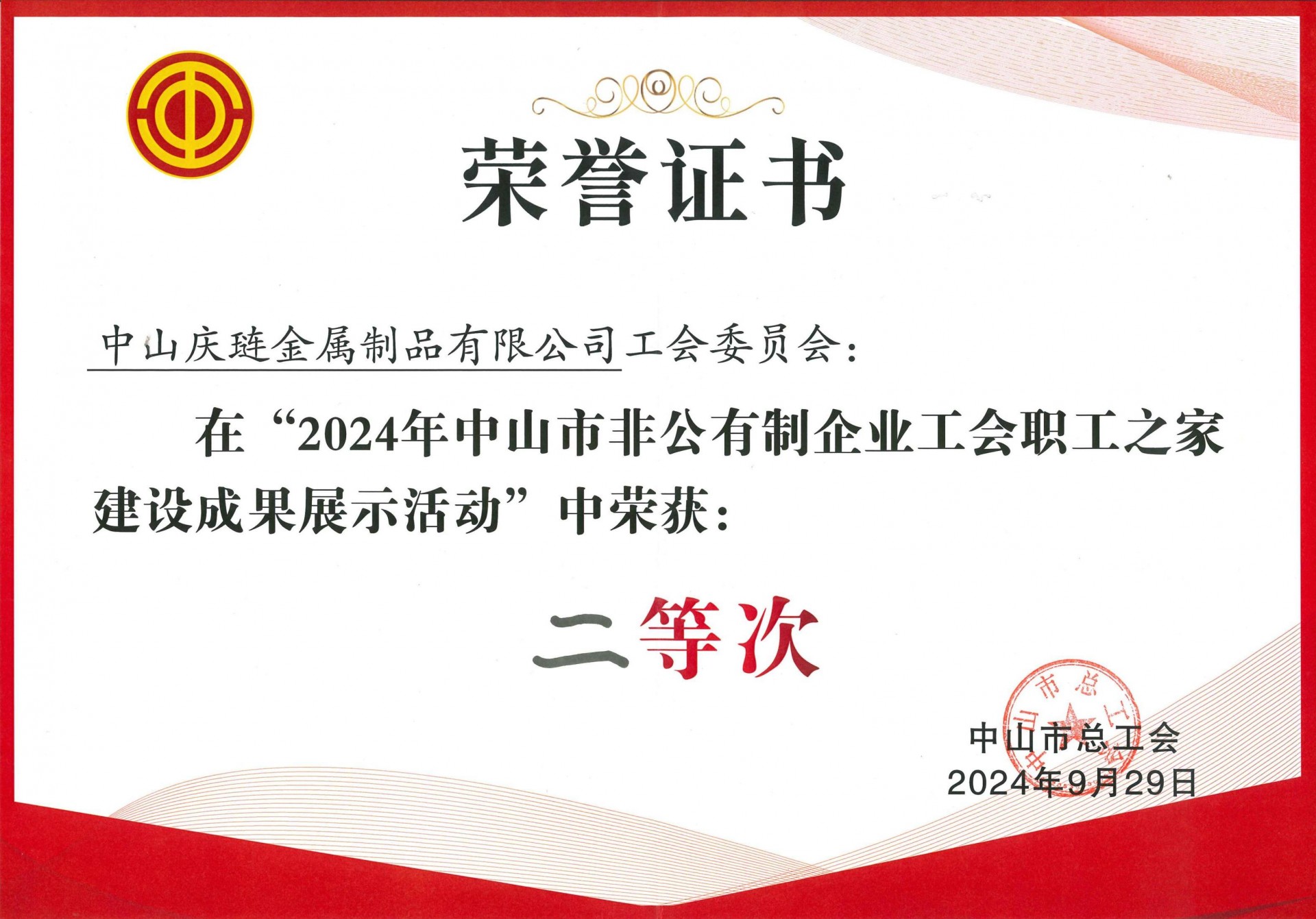 近日,中山庆琏金属制品有限公司工会委员会参加由中山市总工会组织开展的2024年中山市非公有制企业工会职工之家建设成果展示评比活动,获得二等奖及三万元奖金。