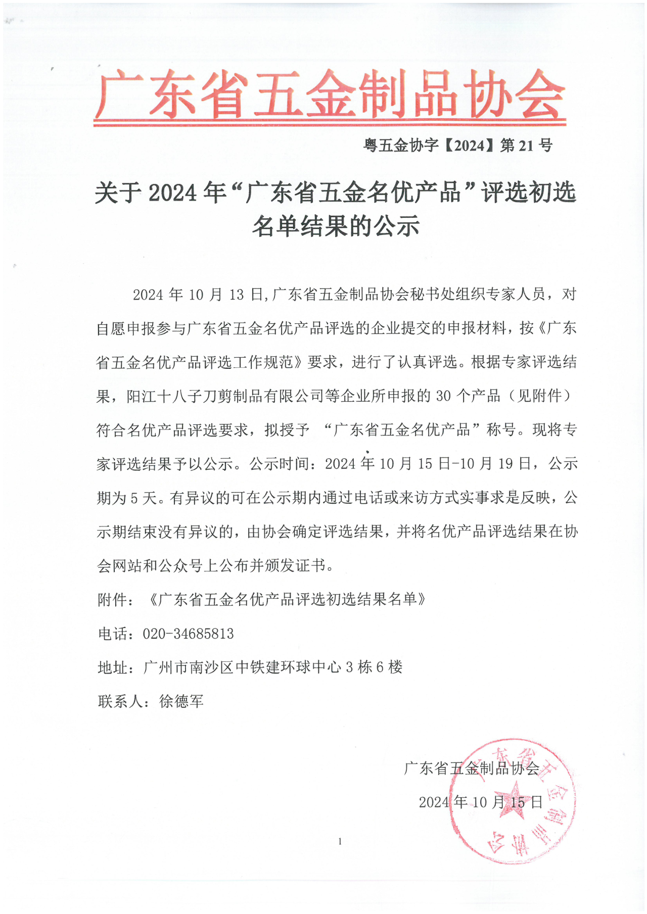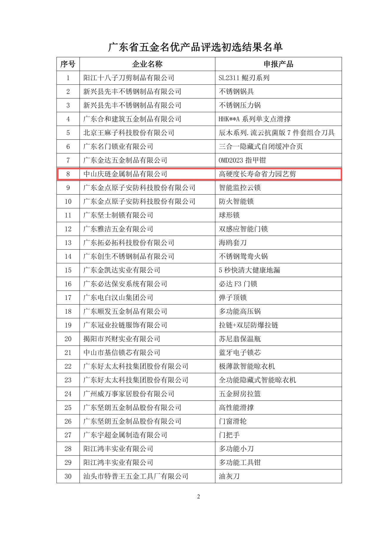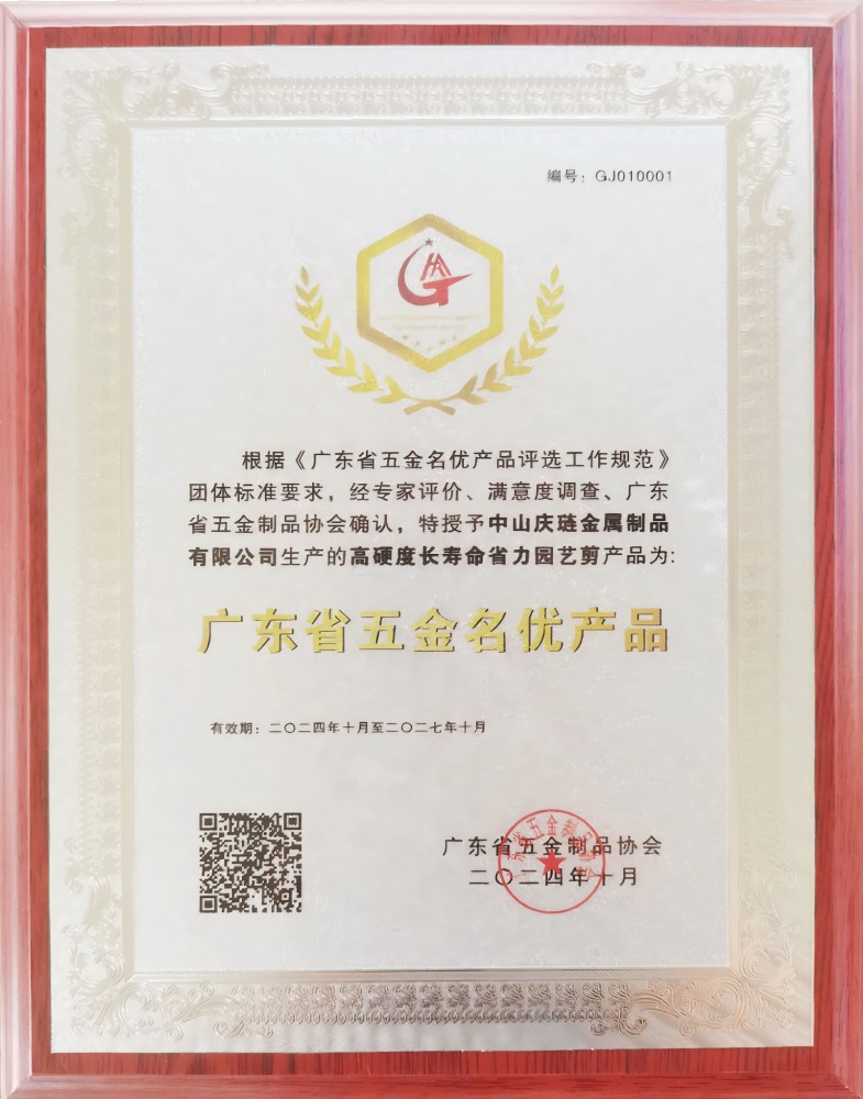 近日,广东省五金制品协会秘书处组织专家人员,对自愿申报参与广东省五金名优产品评选的企业提交的申报材料进行了认真评选。根据专家评选结果,中山庆琏金属制品有限公司所申报的高硬度长寿命省力园艺剪符合名优产品评选要求,拟授予 “广东省五金名优产品”称号。