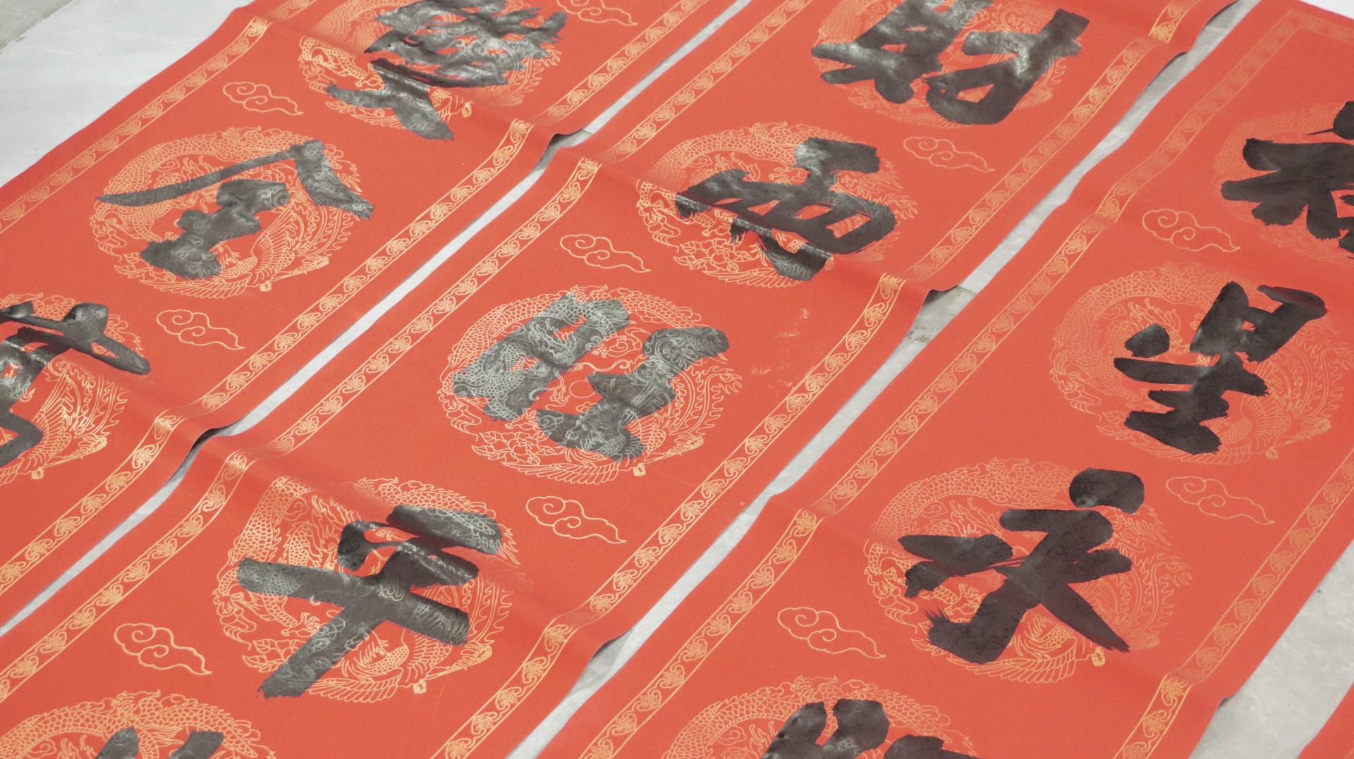 在老师们专注挥毫的同时,志愿者们在一旁帮忙摆放纸张、抻对联,把写好的春联摆在一起晾干,忙得不亦乐乎。一幅幅饱含祝福、吉祥寓意的春联铺满活动现场,呈现一片欢乐、祥和、喜庆的氛围。