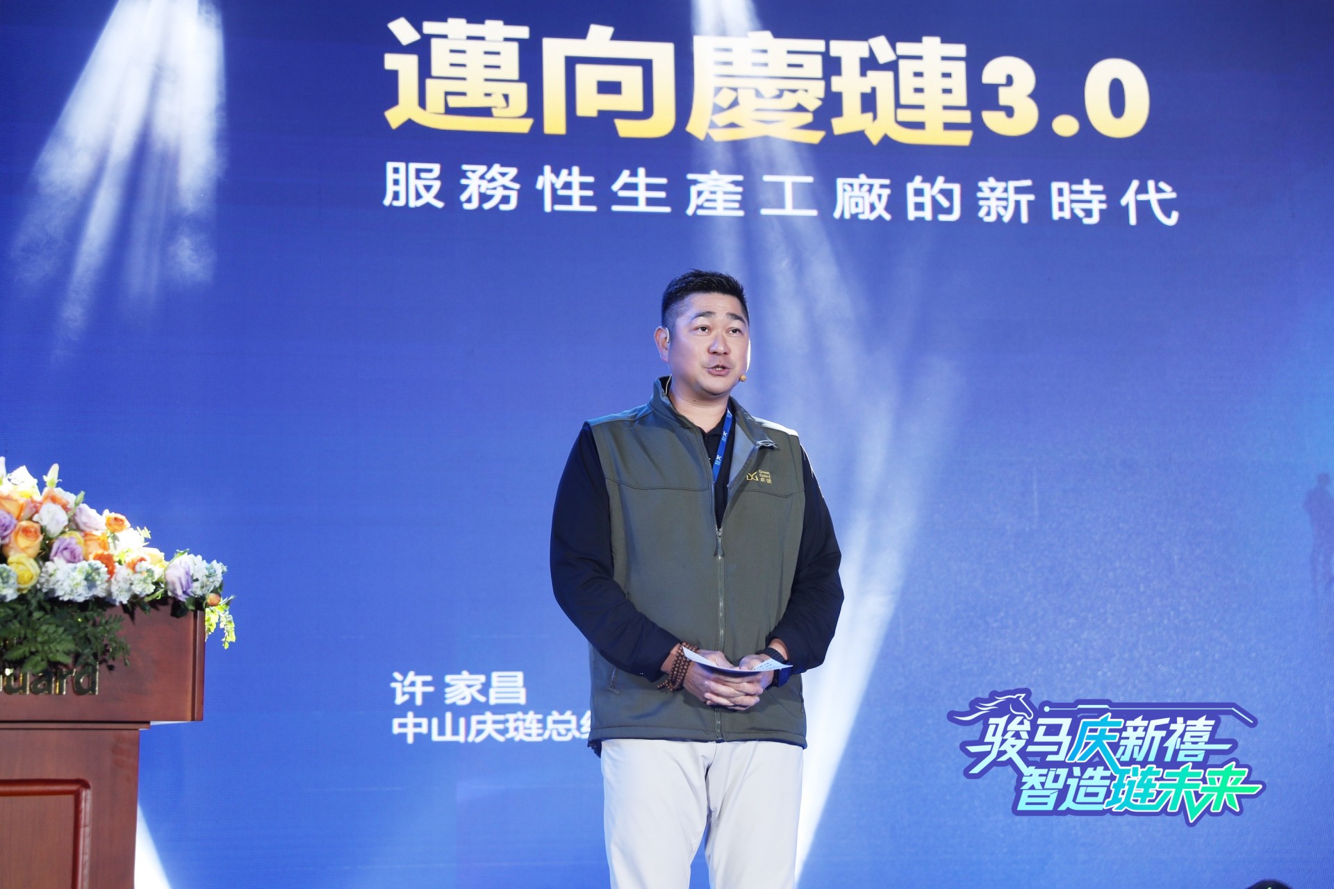 随后,许家昌总经理登台致辞。他表示,2025年公司交出了一份亮眼的答卷,感谢全体员工的辛勤付出;2026年,公司将致力于打造服务性生产工厂,坚定迈向庆琏“3.0时代”,以智造赋能,以创新驱动,续写高质量发展新篇章。